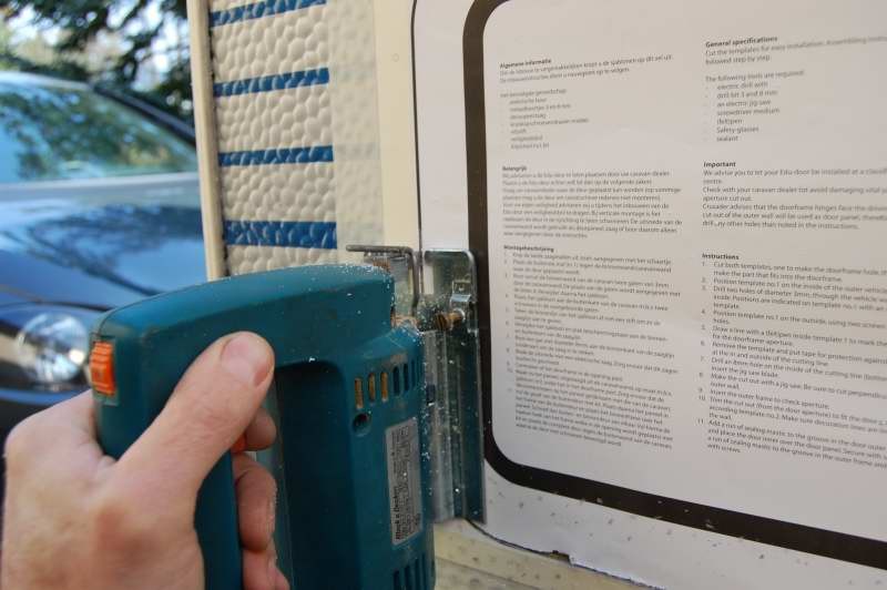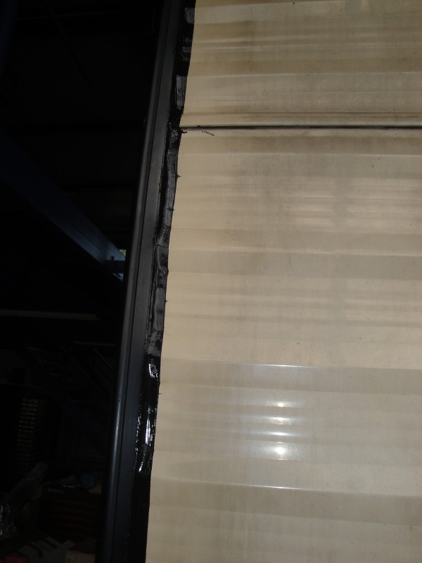 am nächsten tag wollte ich dann auf den linken wand die belüftung und die deckenlampe entfernen. da ist es passiert... ich steig mit dem linken fuss auf den einstiegschemel (drecksplastik), der brach, weil er einen riss hatte, den ich nicht gesehen hatte. mein linkes bein hat es dadurch ans womo gezogen und ich bin mit der aussenseite meiner wade am scharfen blech der türöffnung (türe und rahmen waren entfernt, da neu abgedichtet wird) runtergeschrammt. ich habe mich regelrecht an dem blech filetiert, eine fleischscheibe von ca 5cm breite hing am bein. zum glück war meine frau da und hat mich sofort zum notarzt gefahren. nun sitze ich vorm pc und mein bein "pumpt" wie sau. gehen fällt schwer und auf der linken seite (meine einschlafseite) liegen geht garnicht. und am wochenende muss ich ca 1500 km mit dem auto fahren. :cry: :cry: :cry: hier wenigstens noch ein bild vom blech beim einstieg, das mir den schnitt zugefügt hat.
