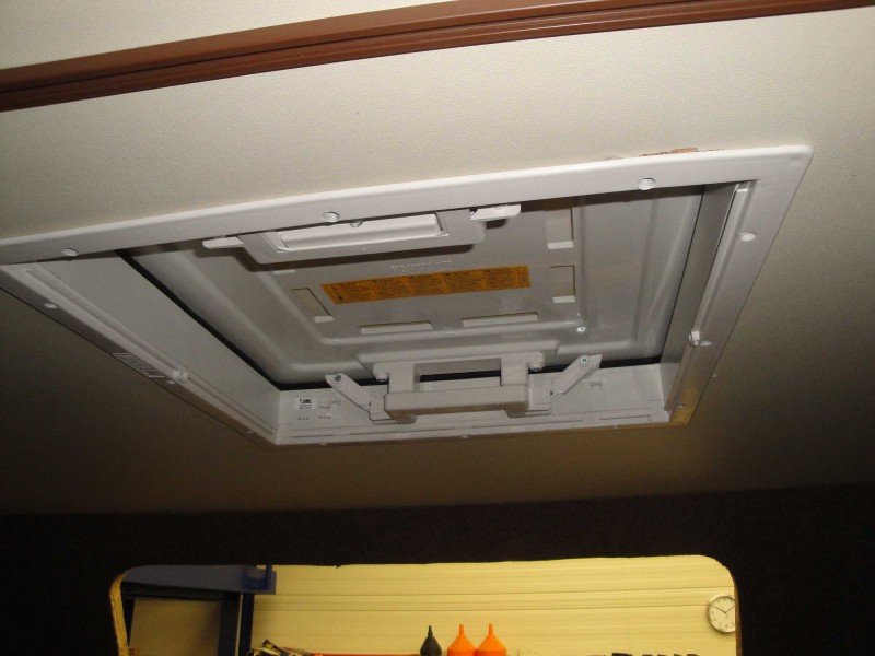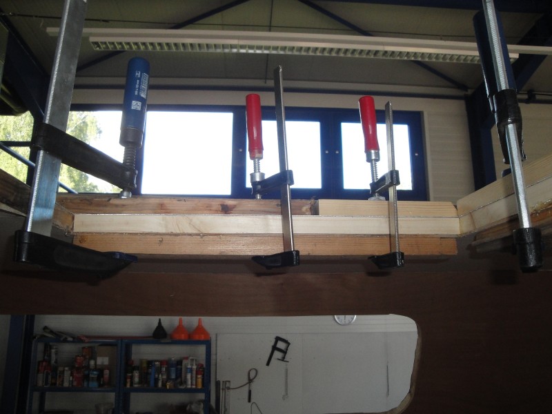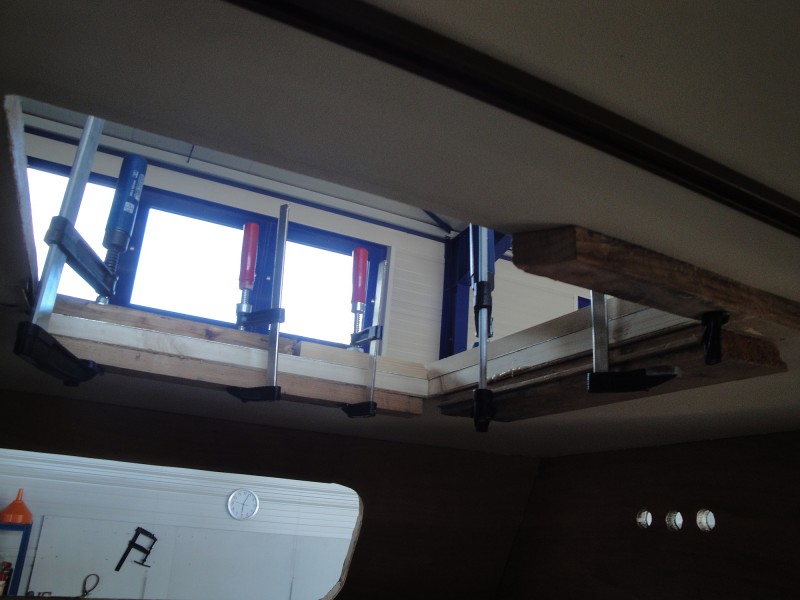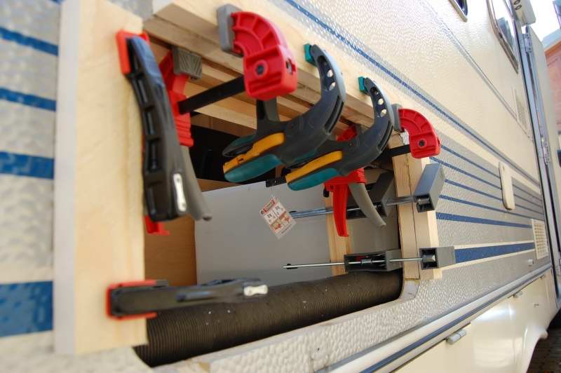 und zum schluss noch zwei bilder vom dachlukenauschnitt. die latten habe ich mit caravankleber eingeklebt und mit schraubzwingen und holzlatten fixiert. der schreiner hat mir für die beiden leisten saftige 15 euro abgenommen. aber das blöde mass 32x22 findet man sicherlich in keinem baumarkt.