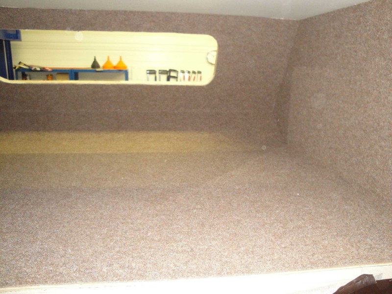 hier schon mal ein bild nach dem teppichlegen. ich habe mich für filz entschieden, da genau dieser vorher auch drin war und er auch gut feuchtigkeit aufnimmt und langsam wieder abgibt. geklebt habe ich ihn mit pattex "kleben statt bohren" der verbrauch ist aber immens, 4 kartuschen für den boden, front und rechte seite. das mittelteil (boden und front) habe ich übrigens aus einem stück geschustert. war zwar garnicht so einfach, aber es hat geklappt und ich bin schon etwas stolz drauf. die unterschiedliche farbe auf dem bild ist eigentlich keine. das kommt vom einfallenden licht meiner halle und dem blitz des fotoapparates.