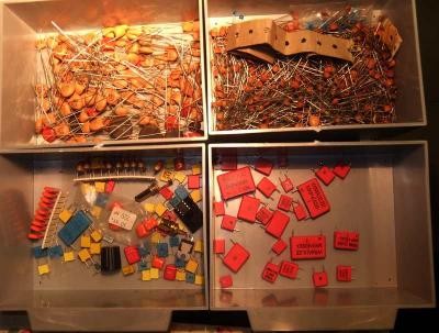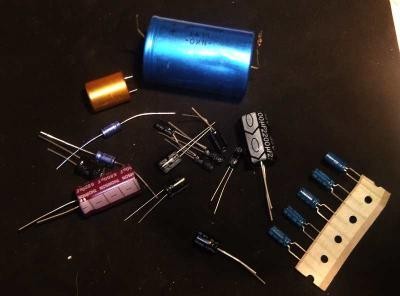 Oben "normale" Kondensatoren, unten Elektrolyt-Kondensatoren, auch Elkos genannt.