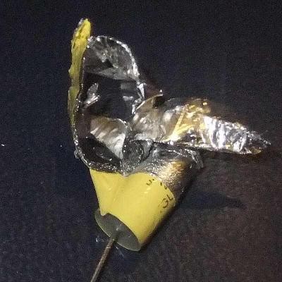 Wir legen also ein Stück Alufolie auf den Tisch, ein etwas größeres Stück Plastikfolie drüber und wieder ein kleineres Stück Alufolie oben drauf. Die Folien dürfen sich nicht berühren. Dann wickeln wir alles wie ein Baumkuchen zusammen und fertig ist er. Er hat einen eigenen Namen: Folienkondensator.