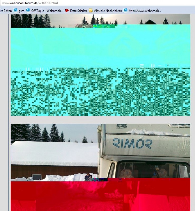 jennergruhle hat geschrieben:Das ist kein Grafikkartendefekt - so etwas würde man am ganzen Bildschirm sehen. Hier sind Bilder defekt oder nicht komplett angezeigt - man sieht ganz deutlich, dass die Bilder zu einem Teil normal geladen wurden und dann abbrechen (nur noch grün, rosa usw.). Ich würde mal den Browser-Cache des Firefox löschen (Menü Extras -> Chronik löschen -> Cache anhaken, löschen) und die Seiten dann neu laden. Hast Du schon einen andeen Browser probiert?