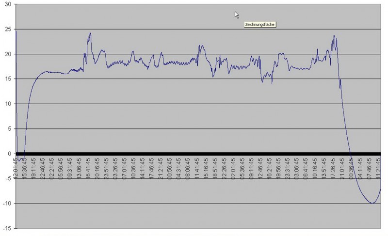 wir waren von 2.2. bis 6.2. im Großraum Nördlingen wandern, wobei -17 grdC Außentemperatur erreicht wurden. (geplantes Ski bei -25 grdC + windchill wäre dann doch zu heftig gewesen) dabei habe ich mal die Temperatur vorne im Fahrerhaus (Integrierter) etwa in Höhe des linken Ohres des Fahrers gemessen und aufgezeichnet: