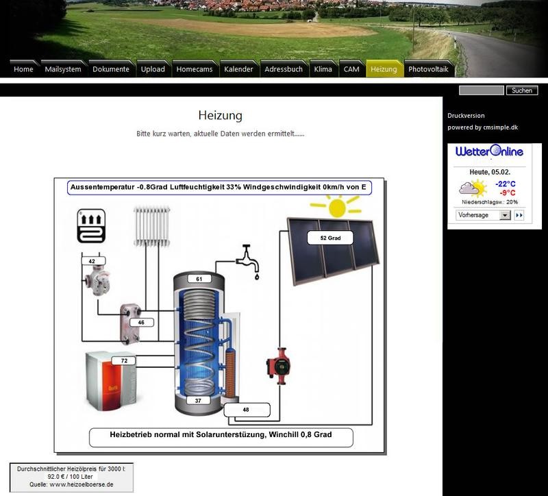 Die Temperaturanzeige Außentemperatur stimmt mittags von 15:00-18:00 Uhr nicht, da sie Sonne drauf scheint. Es hat -8 Grad. Der Server steht allerdings bei mir zu Hause und kontrolliert das Haus, samt PV, Solar und Heizung. Ich denke ihr könnt schon an den Menuepunkten sehen, was ich alles integriert habe. So habe ich auch von unterwegs alles im Griff. Allerdings ist diese Seite zusätzlich nur mittels VPN-Software erreichbar. So viel Datenschutz muss sein :D Das verrückteste: cmsimple braucht keine Datenbank! also ich würde auch wordpress nehmen und wenn es erstmal zum probieren sein soll einfach auf wordpress anmelden und ne site erstellen geht ratz fatz einfacher geht es kaum und sieht von anfang an gut aus......