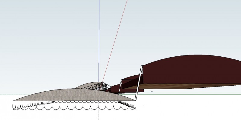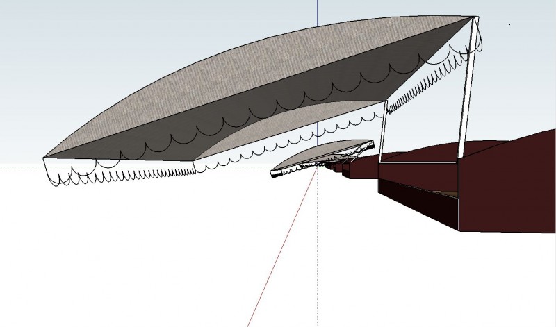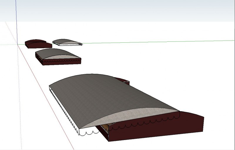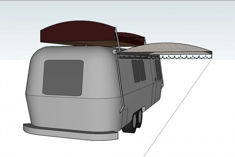 Konkret habe ich mir folgendes Vorgestellt: Eine Dachbox aus Siebdruckplatten, deren Abdeckung als Sonnensegel einfach ausgezogen werden kann. Die Haube soll aus dem Isomaterial sein. Dafür spanne ich es auf einen Rahmen aus Alurohren an den geraden Kanten und Karbonstangen an den gewölbten kurzen Seiten. die Karbonstangen stehen dann unter Spannung ähnlich wie in einem normalen Zweimannzelt. Der Deckel wird für die Nutzung als Sonnensegel einfach seitlich ausgezogen und in die Regenrinne eingehakt.
