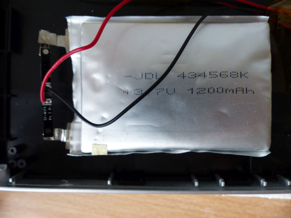 also das Bild mit Akku. Das Teil am Akku ist offensichtlich die Ladekontrolle sagte mein ortsansässiger Elektronikhändler. Wo gibt es derartige Akkus? Der Akku ist 6 x 4 cm und sehr flach.