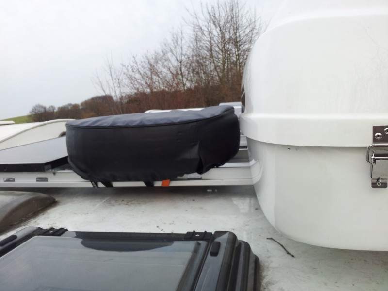 nun stelle ich meine Lösung auch noch als Bild ein. Eine Hülle kommt noch drüber. Auch mein Ersatzrad wird mit einem Gurt gehalten. Die Zielscheibe fürs Bogenschießen habe ich bei der Gelegenheit auch gleich mit aufs Dach gepackt. Die Winkel und der Abstandshalter sind mit Sikaflex geklebt. Viele Claudius