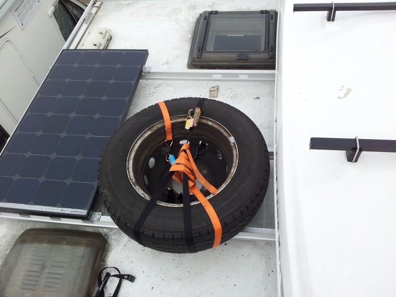 Und für die Bedenkenträger sei vermerkt, dass ich das Womo an diesen Winkeln aufhängen könnte (1,6 qdm Sikaflex), wenn das Dach dies aushalten würde. Die Klebeverbindung würde jedenfalls nicht reißen. Eine praktische Hülle werde ich noch basteln oder bei ebay schießen, geht wohl schneller. Viele Claudius zur Befestigung des Ersatzrades hat sogar der Gesetzgeber sich Gedanken gemacht. Dieses muß mit zwei voneinander unabhängigen Sicherungen gesichert sein Ich habe es mit 3 Spanngurten befestigt, das sollte dann wohl reichen.