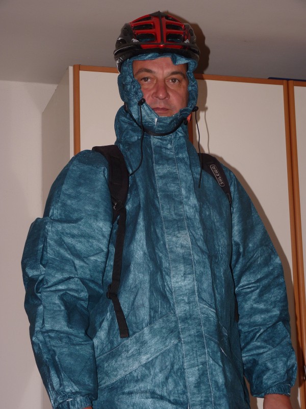 Geladen werden die Akkus nur über Solar aus dem Wohnmobil. Das Ladegerät verträgt klaglos auch den Strom aus einem Rechteckwandler. Auf meinem alten VW T3 hatten wir 90Wp. Das reichte für 8 Tage unplugged stehen, wobei aber neben den Rädern auch noch der Akku fürs Segelboot geladen wurde. Dazu ein wenig PC, Lötkolben, Handy laden, ...... Nach 8 Tagen waren alle Batterien kontrolliert leer, aber da mussten wir eh abreisen. Mit 10 Ah sind wir von Meereshöhe bis auf 850 m Höhe gekommen. In der Ebene haben wir die 80 km geschafft. Inzwischen haben wir einen 3 Akku mit 10 Ah. E Bikes sind die angenehme Alternative zum Moped. Ich möchte sie nicht mehr missen. Da ich mit meinem Bike auch täglich bei jedem Wetter zur Arbeit fahre (Hin und Rück 16 km und 200 Höhenmeter) mal ein Bild meiner Regenausstattung.