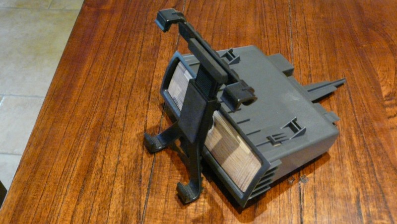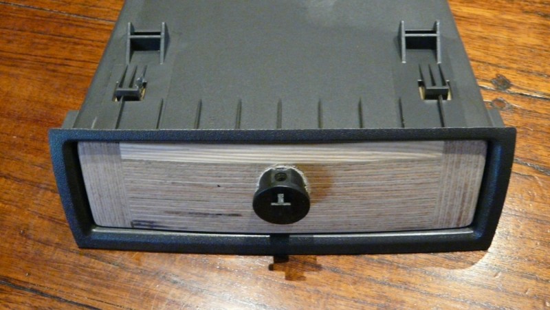 Das Ablagefach über das Radio wurde zweckentfremdet. Aus Holz wurde ein Einschub zusammengeleimt und in Form geraspelt, geschmirgelt und schwarz lackiert. Die Klemmvorrichtung habe ich von meiner gekauften Halterung übernommen und in den Einschub integriert. (fest verleimt). Bei Bedarf kann ich die Halterung aus der Führung herausheben und entnehmen. Die ganze Einrichtung ist konisch im Einschub fixiert und sitzt sehr stabil. Es gibt keine Schwingungen mehr und es sieht auch noch gut aus.