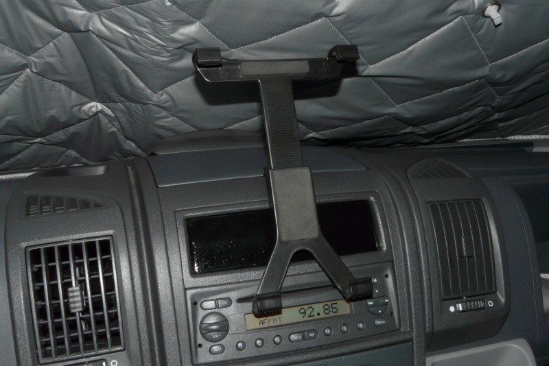 Die iPad Halterung habe ich von Griffin im Internet gekauft. Das war nicht so gut. Es war eine wabbelige Sache. Das iPad zitterte und war während der Fahrt ständig am Schwingen.