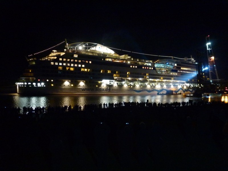 Bevor die Überführungsfahrt beginnt machen wir noch mit dem Roller von Weener aus einen Ausflug nach Papenburg um die AIDAmar im Ausrüstungsdock der Meyerwerft bei Tageslicht zu sehen. Denn wenn die AIDAmar bei Weener durchfährt ist es dunkel und ich kann nicht fotografieren. Papenberg, das wir auch bei dieser Gelegenheit besichtigen, ist eine recht nette, saubere Stadt und durchaus sehenswert. Die AIDAmar war es ohnehin. Bei der Rückfahrt fängt es leicht an zu regnen, so dass wir etwas nass werden – und als wir beim Gogolobil wieder ankommen hört es auf und auch die Sonne kommt vereinzelt wieder zum Vorschein. Die nächtliche Überführung der AIDAmar ist schon ein großes Spektakel. Bisher habe ich so etwas nur im Fernsehen gesehen. Aber hier stehen wir nun um 21:30Uhr am Ufer und die AIDAmar zwängt sich durch die Engstelle der Eisenbahnbrücke bei Weener, wo der Mittelteil extra für diese Emsüberführung durch einen Schwimmkran abgebaut wurde. Da bleiben an Steuerbord- und Backbordseite des Schiffes nur wenige Zentimeter Luft übrig – so eng ist es da!