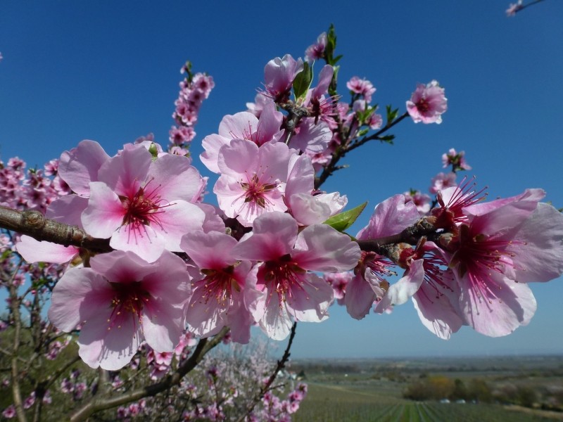 Vorbei an Stuttgart und Karlsruhe fuhren wir weiter in Richtung Norden. Denn in Gimmeldingen war am Tag zuvor das bekannte Mandelblütenfest mit über 20.000 Besucher. Das wollten wir uns natürlich nicht antun – das mit den Menschenmassen. Aber die Mandelblüten wollten wir natürlich schon sehen. Einen Tag nach dem Mandelblütenfest blühen die Bäume immer noch und es sind wesentlich weniger Menschen auf den Straßen und zwischen den Bäumen. Wein wird an den Ständen am Wegesrand immer noch ausgeschenkt und da wir zu Fuß zwischen den Mandelbäumen umherspazieren, können wir auch etwas trinken. Der Stellplatz für das Gogolobil ist beim Weinland Königsbach – hier können wir für ganz wenig Geld mit herrlichem Blick auf die Rheinebene übernachten.
