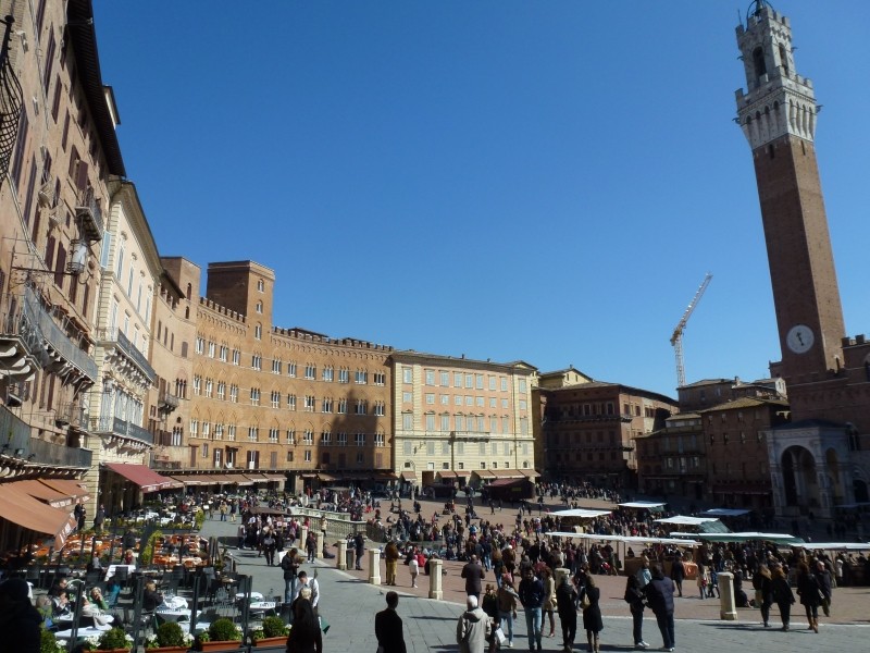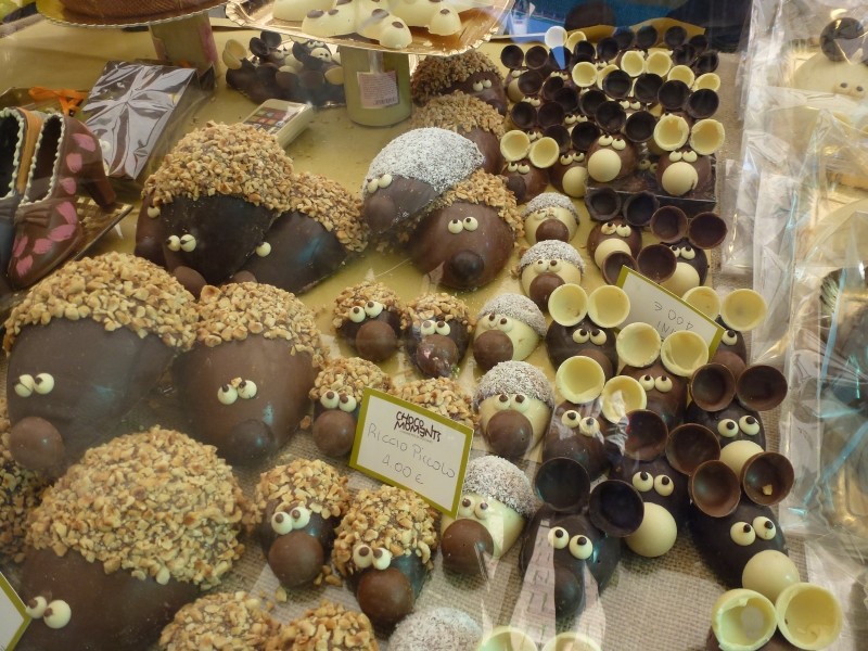 Casciano die Murlo kennen wir schon, denn dort haben wir schon zweimal das Weihnachtsfest im Gogolobil auf dem dortigen, ganzjährig geöffneten, Campingplatz verbracht. Unser „Stammplatz“ mit der besten Aussicht auf den terassenartig angelegten Plätzen war noch frei – kein Wunder, denn wir waren zunächst die einzigen Gäste auf dem Campingplatz. Das Wetter ist wieder schön, aber noch für Rollerausflüge zunächst zu kalt. In das Ortszentrum sind es aber nur 1 km zum gehen und das taten wir auch, denn am nächsten Tag war Wochenmarkt und wir wussten schon von früher, dass dort auch ein Stand mit frischer Porcchetta ist. Porcchetta ist eine Art Spanferkel ohne Knochen, gerollt und im Inneren sind die Innereien und viele Kräuter sowie eine Unmenge von Knoblauch. Das ganze Schwein wird dann langsam über offenem Feuer gegrillt und anschließend in dünne Scheiben aufgeschnitten und mit knusprigen Weißbrot gegessen – hervorragend!!! Wenn ich schon in Lucca auf mein „Frati“-Gebäck (Schmalzgebäck aus Zitronenteig) verzichten musste, dann habe ich wenigstens Porcchetta erhalten. Ruhetage sind auch notwendig, denn wir sind weder auf der Flucht noch in einem zeitlich beschränkten Urlaub, sondern auf Reisen. Und diese Reise soll – im Gegensatz zu unserer letztjährigen Asienreise - eine Erholungsreise sein. Und so kommen die Liegestühle wieder zum Einsatz. Das Wetter ist prächtig und auch die Aussichten für die nächsten Tage sind äußerst positiv mit Temperaturen bis ca. 20°C. Nur der Wind weht die ersten Tage ziemlich stark von Nordosten. Nicht unangenehm, aber lästig. Auch Wäsche waschen muss mal sein, nachdem am Campingplatz auch Waschmaschinen stehen. Auch zum kochen habe ich etwas mehr Zeit und so mache ich uns an einem Abend eine rosa gebratene Entenbrust mit Orangensauce und Trüffelpolenta. Der Wind wird leichter und so schwingen wir uns an einem der Tage auch auf den Roller und fahren nach Siena. Denn erstens ist Siena eine absolut sehenswerte Stadt und zweitens findet gerade auf dem Campo – so heißt der zentrale Platz – ein Schokoladenfestival statt. Mit dem Roller konnten wir fast bis ins Stadtzentrum fahren, auch durch die verkehrsberuhigten Zonen, die für Autos gesperrt sind. Wir schlendern durch die engen Gassen und freuen uns, dass noch nicht soooo viele Touristen unterwegs sind. Nur Asiaten, die können wir in der Toskana zu jeder Jahreszeit treffen. Aber während sich die Italiener auf dem Campo schön gemütlich für eine Stunde in die Sonne setzen oder liegen, haben die Asiaten für so etwas keine oder kaum Zeit. Entweder hetzen sie über den Platz und fotografieren noch während des Gehens oder sie sitzen sich mal für maximal 10 Minuten auf den Campo um dann aber sofort wieder aufzuspringen und rastlos einer Gruppe nachzulaufen. Wir machen es uns auch für eine Stunde auf dem Campo gemütlich und schauen auch zu den vielen Ständen mit den Süßigkeiten des Schokoladenfestivals. Was es dort nicht alles aus Schokolade gibt – da sind wahre Schokoladenkünstler dabei! Pralinen, Schokoladen- und Pistaziencreme, Kunstwerke aus Schokolade in verschiedenen Farben und viele andere Leckereien.