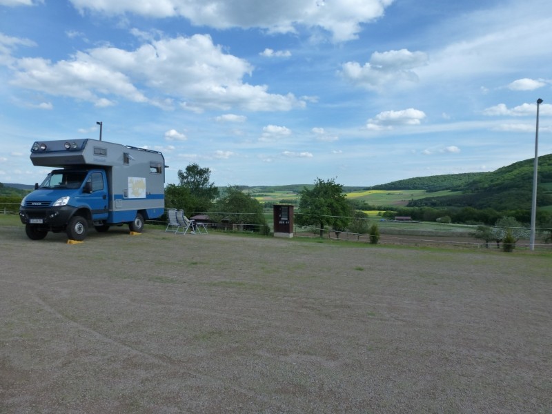 Eine nette Abwechslung war auch der Besuch eines Forummitglieds und dessen Ehefrau :hallo: mit denen wir dann zum Abendessen gingen. Es gab gegenseitig sehr viel zu erzählen und es wurde ein recht netter Abend in gemütlicher Gesellschaft. Danke für den Besuch! Es wird in Hamburg nun recht bewölkt, es fängt stellenweise an zu regnen und die Temperaturen sind nicht mehr frühlingshaft. Nachdem der Wetterbericht für das Wochenende des Hafengeburtstages eine Regenwahrscheinlichkeit von über 70% und Temperaturen um 10° angekündigt hat entschlossen wir uns vorzeitig in den warmen Süden aufzubrechen. Nachdem wir das Spektakel „Hafengeburtstag“ schon dreimal gesehen haben fiel uns diese Entscheidung nicht schwer, denn irgendwann ist auch die längste Reise zu Ende und wir machen uns wieder langsam auf den Heimweg. Es geht über Hammelburg, dort ist ein schöner neuer Stellplatz „zum Forellenhof“ bei N 50°07’59“ O009°49’08“ (--> Link) in herrlicher ruhiger Lage und toller Aussicht über das Tal. Ringsum blühen die Rapsfelder in ihrem herrlich leuchtenden Gelbgrün. Zum Stellplatz gehört auch noch ein großer Streichelzoo mit vielen Tieren und eine Gastwirtschaft mit regionalen Spezialitäten. Der Besitzer des Stellplatzes bringt morgens ofenfrische Brötchen ans Wohnmobil. Außerdem sind wir jetzt wieder in der bayerischen Heimat! Die Temperaturen bertagen um die 30° und es scheint die Sonne.