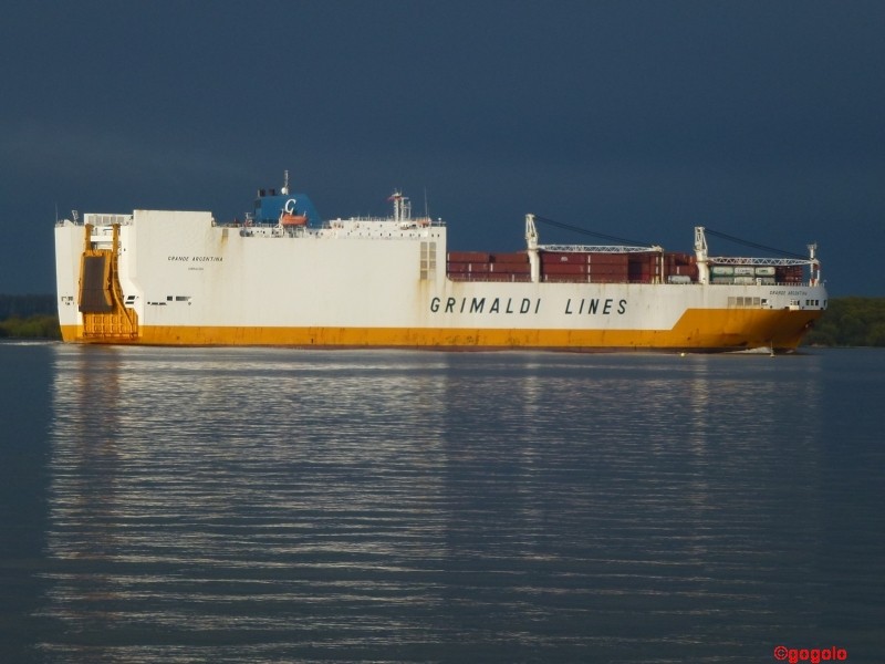 Ein Schiff der Grimaldi-Line, das uns möglicherweiseim nächsten Jahr nach Südamerika transportieren wird, fährt ganz nahe am Stellplatz vorbei und ich bekomme Fernweh. Leider ist es am Abend und das Licht für gute Fotos ist relativ schwach. Aber andere Schiffe sind auch schön und interessant. Hier die Grimaldi-Fähre: