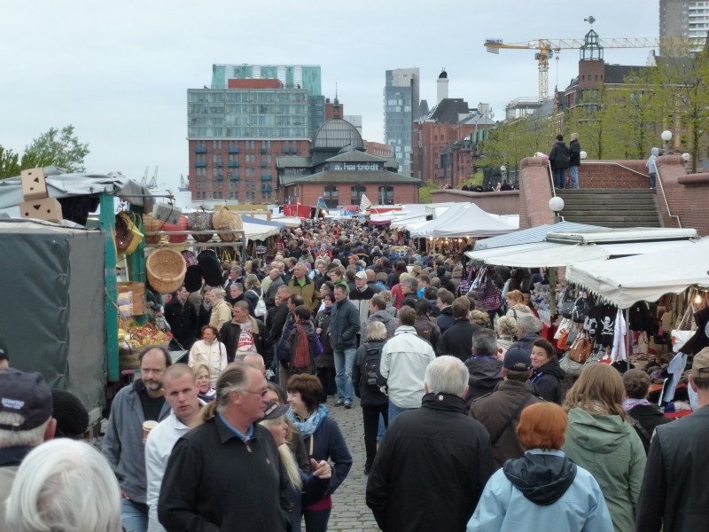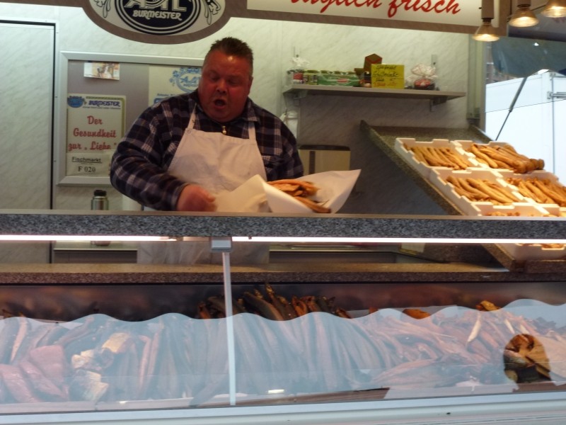 Fischmarkt am Sonntagmorgen Der Fischmarkt ist auch nicht mehr das, was er früher war! Um 6 Uhr morgens waren wir schon in der S-Bahn bzw. an der Haltestelle Reeperbahn (jetzt war ich doch auf der Reeperbahn!) und gingen zwischen der Nuttenspätschicht zum Hafen. Wir haben festgestellt: die typischen Hamburger Marktschreier gibt es nicht mehr – vieles ist fest in ausländischer Hand, der typische Hamburger Witz seitens der Verkäufer fehlt leider total. Wir standen mit dieser Meinung nicht alleine da…