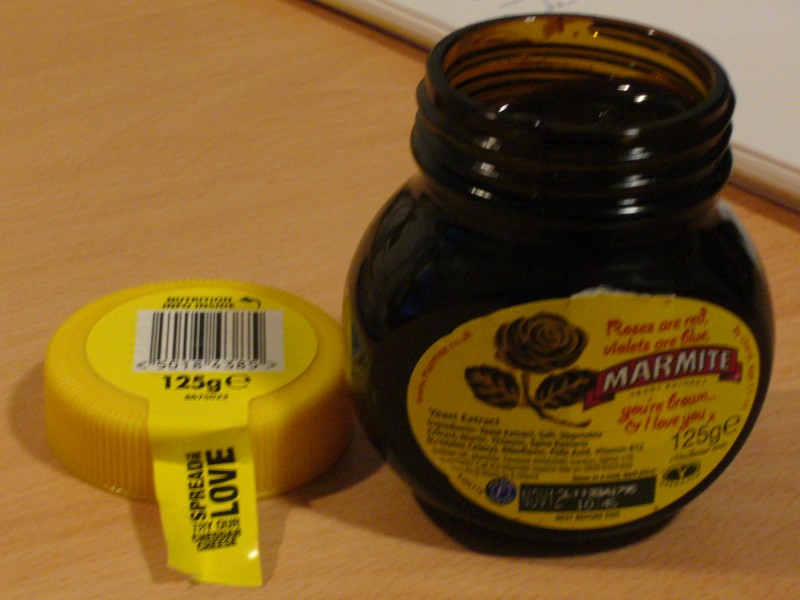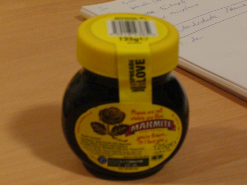 Du hast mich am späten Abend noch zu einem Selbstversuch animiert. Ich habe seit letztem Sommer noch ein ungeöffnetes Glas Marmite im Schrank. Mir hatte jemand gesagt, seine Freundin würde das immer essen, das sei so gesund. Ich habe das für eine Art Kunsthonig gehalten. Die Bilder belegen: Noch ungeöffnetes Glas und geöffnet.(Die diversen Sherlocks hier hätten das sowieso herausgefunden.)Und probiert.