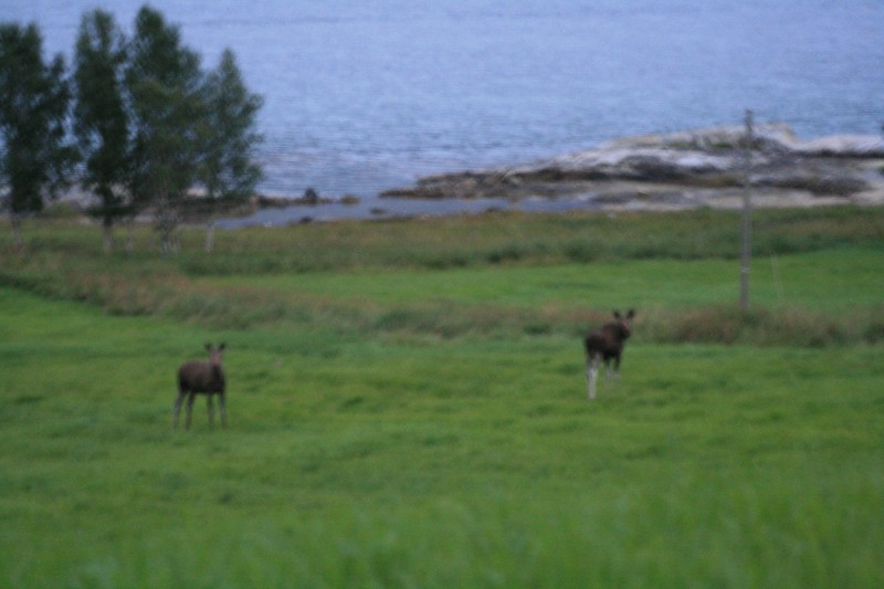 Wir fuhren den Kystriksveien 17, suchen eine Übernachtungsstelle. Am Saltstraumen darf man nicht stehen. Aber erst mussten wir noch die obligatorischen Elche knipsen, auch wenn es eigentlich schon zu dunkel war für tolle Photos. Kaum hatten wir sie erwähnt, stand auch schon ein Geschwisterpärchen am Straßenrand und guckte.