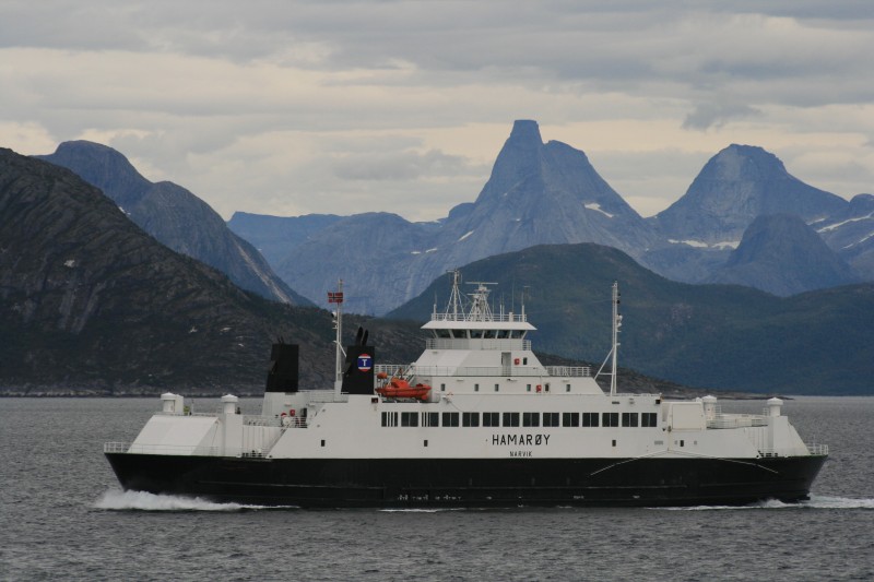 mit der Fähre Skaberget-Bognes setzten wir auf's Festland über. Der Stetind, Norwegens berühmter Berg, lachte uns an. Bis jetzt kannten wir ihn nur von unserem Kartenspiel, obwohl wir schon mal diese Route genommen haben. Wahrscheinlichkonnten wir ihn wegen der Wolken nicht sehen.