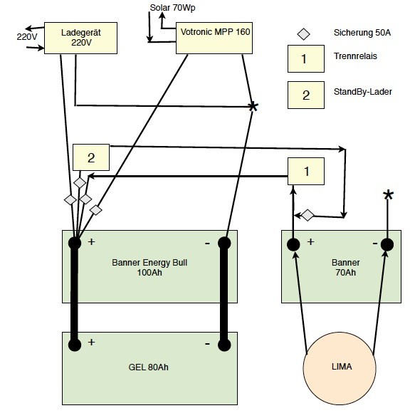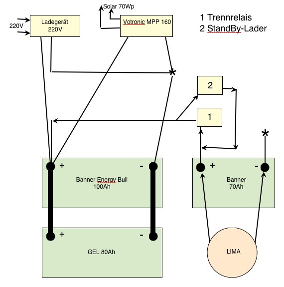 nun das Problem, ich habe eine 100er Banner ENERGY BULL als Versorger drin, nun soll die 80er GEL dazu eingebaut werden, wie kann ich diese beiden verschiedenen Batterietypen mit Landstrom oder mit Solar laden...