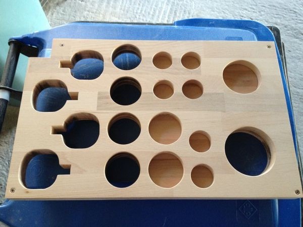 Diesmal habe ich eine Hartholzplatte aus Buche genommen & entsprechend der Teile die Aussparungen gesägt.