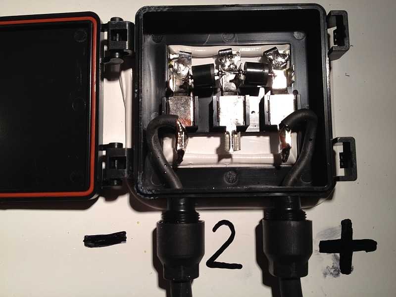 Um später zu wissen, wie die Leitungen angeschlossen sind hab ich die Kabel markiert. Die Stecker sind so angeschlossen, dass man die Leitungen nicht verpolen kann.