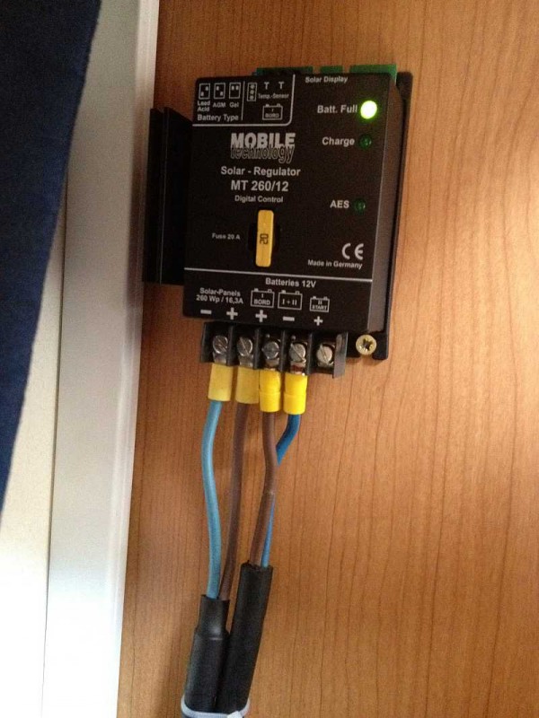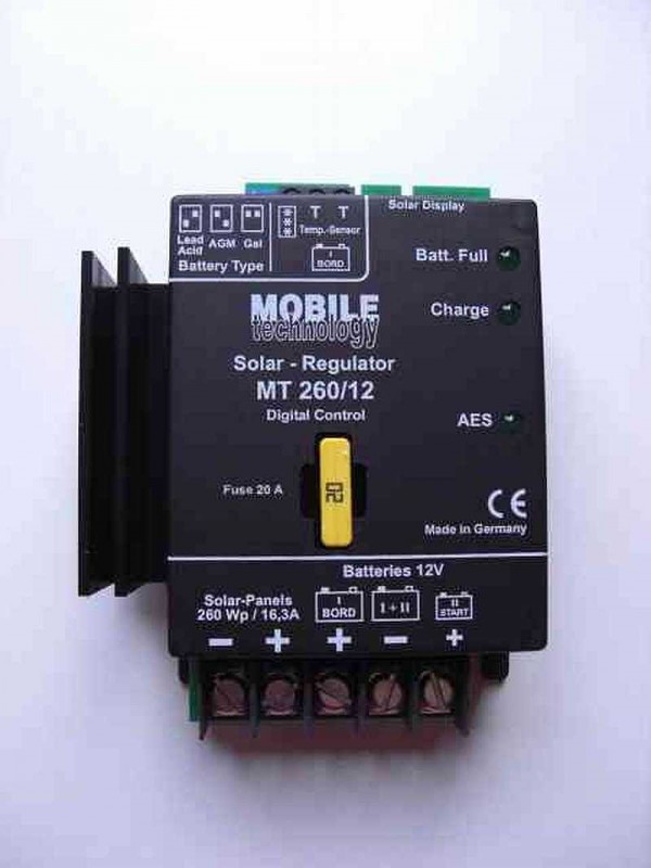 als Laderegler hab ich einen "Mobile Technology - MT 260-12" (ist ein wenig überdimensioniert :), da dieser 260 WP verträgt)