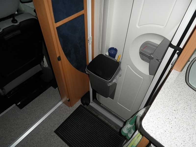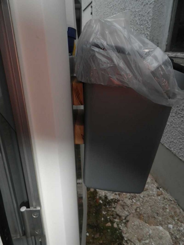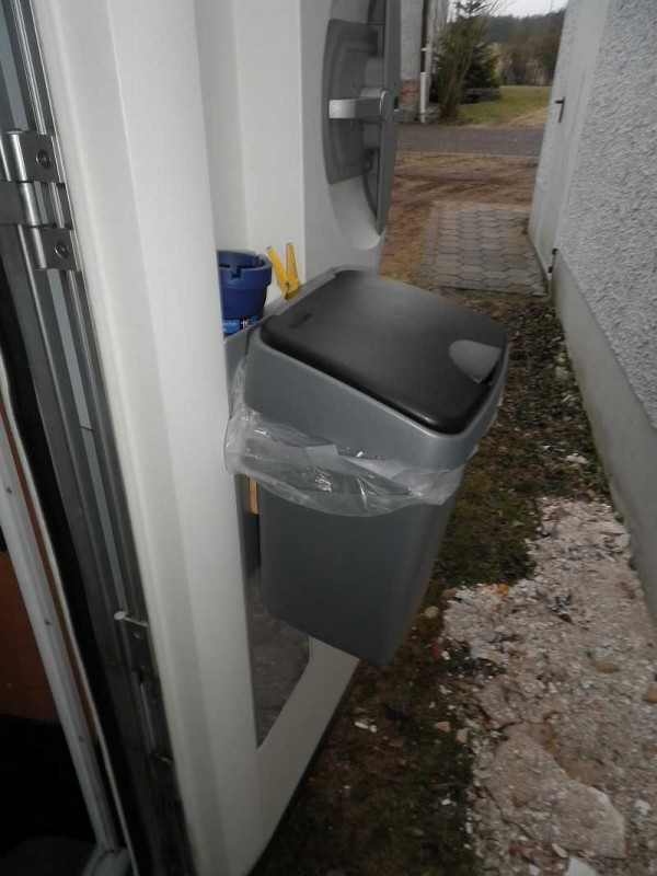 den Mülleimer hab ich einfach mit zwei Latten, damit man ein wenig Distanz für den Deckel bekommt, an das Ablagefach der Aufbautür geschraubt. Verschraubt ist es mit handelsüblichen Maschinenschrauben (M6) & selbstsichernden Muttern. In den Eimer passen die handelsüblichen 20l Tüten mit Henkel.