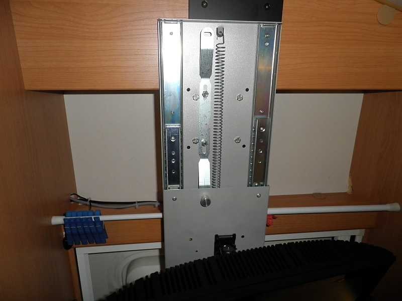 Als Grundhalter kann man jeden handelsüblichen VESA-Halter nutzen. Darunter habe ich einen ausziehbaren Schlitten geschraubt. Der Schlitten ist federgestützt & kann in den Endpositionen arretiert werden.