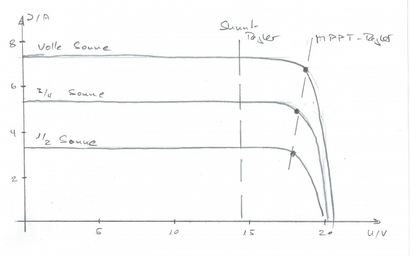 das Panel liefert fast unabhängig von der Beleuchtung eine ziemlich konstante Spannung, während der Strom proportional zur Sonneneinstrahlung ist (gezeichnet 3 Kurven) der MPPT-Regler läuft in kurzen Zyklen entlang der Kennlinie (= tracking) und schaut wo das Produkt aus Strom und Spannung am höchsten ist (= max power point), in der Skizze am Knödel weil die Spannung zum Laden der Batterie in diesem Punkt zu hoch ist, wird der Gleichstrom in Wechselstrom umgesetzt, auf rund 14 V heruntertransformiert und wieder gleichgerichtet. In dem Verhältnis wie die Spannung heruntertransformiert wird, wird der Strom hochtransformiert, somit kommt an der Batterie ein höherer Ladestrom an als das Modul liefert im Gegensatz dazu ist der Shunt-Regler auf eine feste Ladespannung eingestellt und schneidet demzufolge alles was rechts seiner gestrichelten Linie ab bzw. verwandelt es in Wärme daraus ergibt sich, je höher die Differenz zwischen Modulspannung und Batteriespannung ist, umso höher ist der Nutzen eines MPPT das ist alles grüße klaus Hallo Klaus,