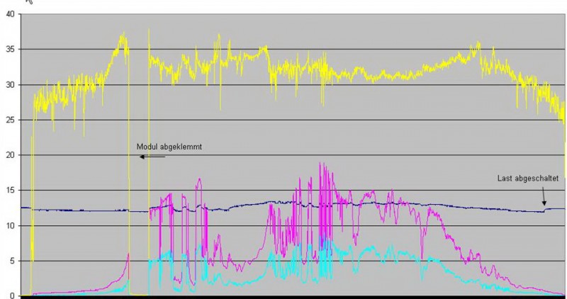 hier sind mal Meßwerte zum Thema MPP-Regler: gelb: Spannung am Modul (2x135W parallel, U(nenn) = 35V dunkelblau: Batteriespannung rot: Ladestrom hinter dem MPP blau: Modulstrom vor dem MPP
