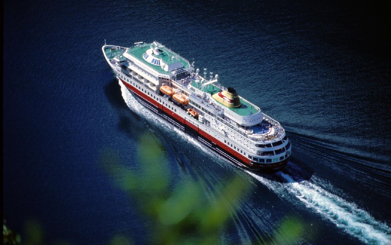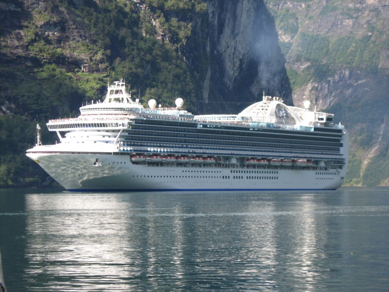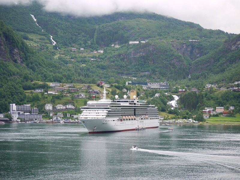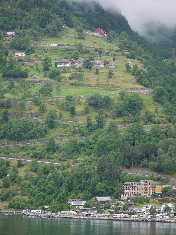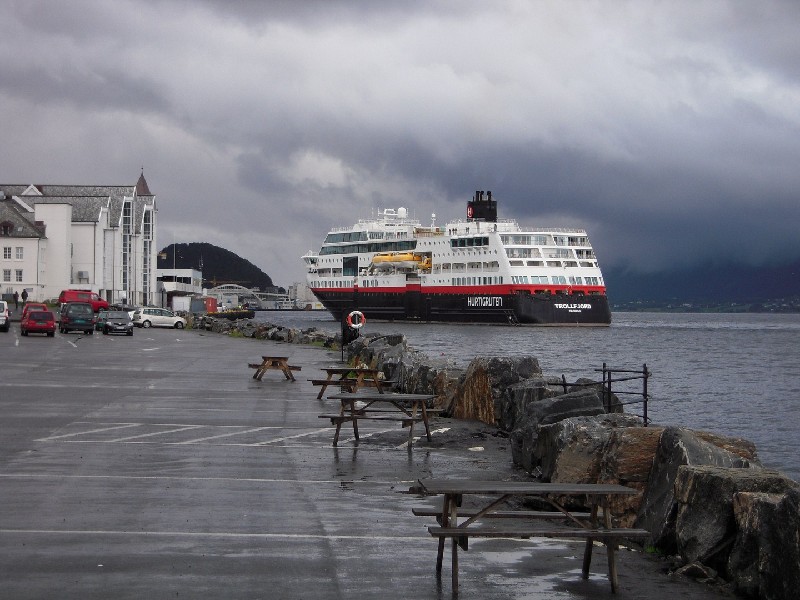 Der Platz liegt etwa 400 m Luftlinie vom Hurtigroutenkai. Herrlich, wenn morgens gegen 9.00 eines der Schiffe sich mit Typhon anmeldet und langsam, in einer großen Kurve zum Anleger gleitet. Das gleiche Schauspiel dann nochmals etwa um 18.00 Uhr, wenn in der Saison (Mai bis September) das gleiche Boot dann aus dem Geiranger nochmals anlegt.