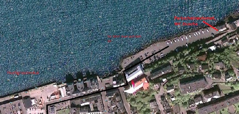 nicht erschrecken, wenn Du dorthin kommst! Die Zufahrt sieht aus, als wolle man auf den Hinterhof der dortigen Häuser! Ist aber richtig so. Die Park-/bzw. SP-Gebühr muss man am hinteren Ende des Platzes zahlen, dort, wo auch die Toiletten und Duschen sind ( ein Wohnhaus, an dem im Erdgeschoss eine Art Terasse angebaut ist, auf der sich der Automat befindet) . Der im vorderen Bereich stehende Parkscheinautomat gilt eigentlich nur für die PKW.
