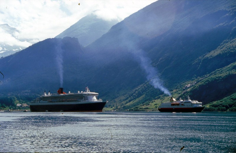 nebenbei, beide Schiffe liegen auf gleicher Höhe, Links die QM2, rechts die Kong Harald