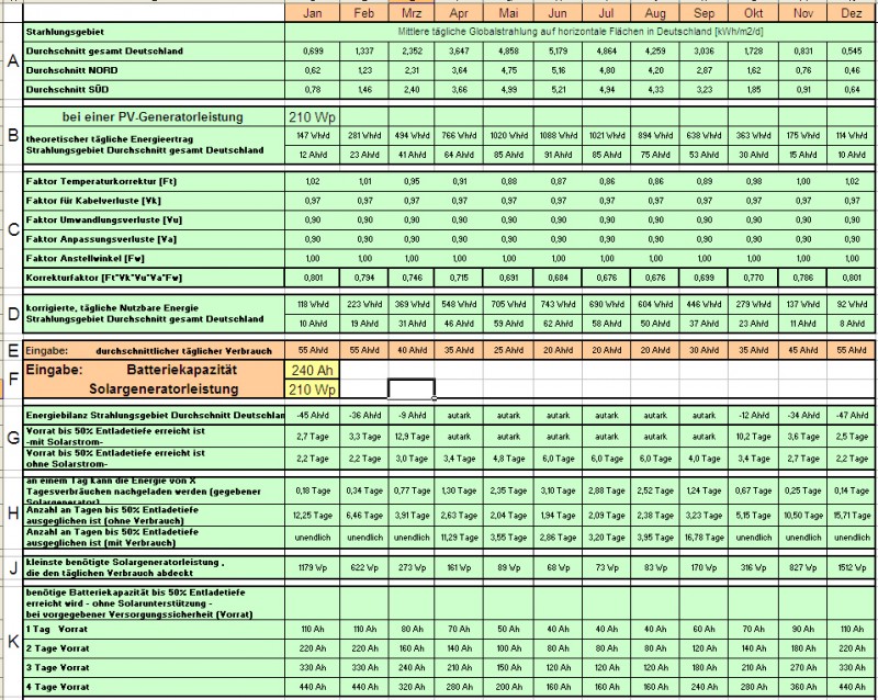 Daher denke ich das man ohne Probleme bei Deinen Wünschen 5 Tage fast immer hinkommt, wenn die 260 Wp montiert, und mindestens 300 Ah Batteriekapazität vorhanden sind. Problematisch sind die Monate November, Dezember da meißt zur Dunkelheit auch dichte Bewölkung (außer letzte Saison :wink: )