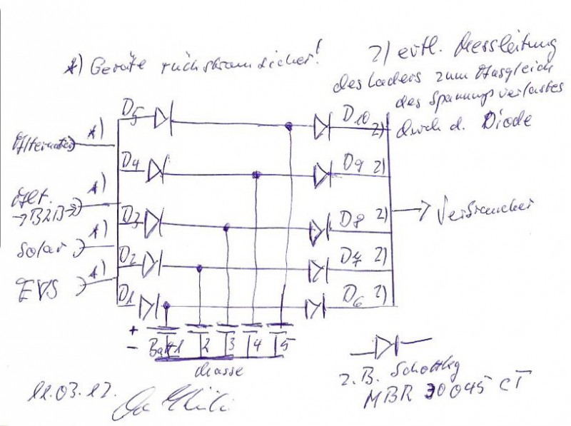 damit sind die einzelnen Batterien absolut voneinander entkoppelt, sodaß der Verlust einer Batterie die restlichen nicht mit runterziehen kann. der Aufwand ist natürlich beträchtlich, da auf der Ladeseite der Spannungsabfall über die Dioden kompensiert werden muß, hier bietet sich dann ein B2B für die Lima an mir würde es vor dem mechanischen Aufwand grausen, da die Dioden elektrisch isoliert befestigt werden, dicke Batteriekabel montiert und noch rund 20W Verlustleistung abgeführt werden müssen wie bereits gesagt, was für Spezialisten grüße klaus Hallo Rolf, sehr gern, können wir noch machen, vielleicht haben andere Interesse dran. Schicke mir PN oder mein altes Kennzeichen deoli bei der Post in de. Richi Hallo,