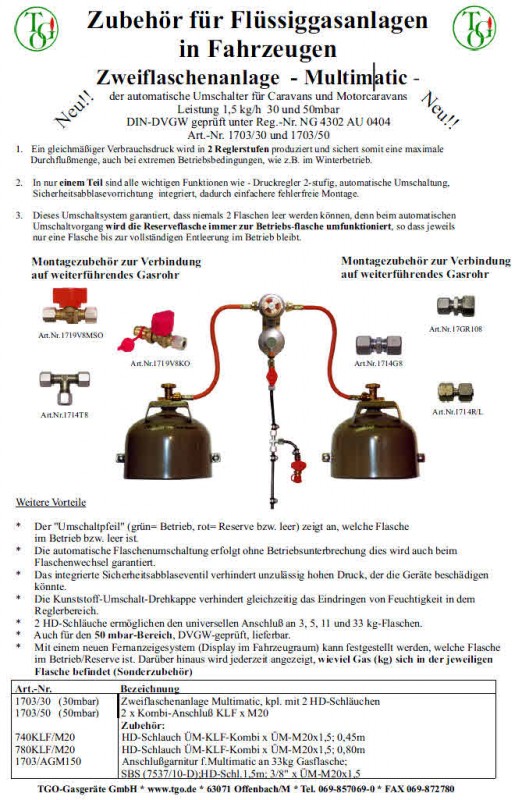 Die Multimatic hat eine Zulassung, genau wie Ihre Schläuche auch. Wem das aber nicht reicht, die Schläuche die man bei Truma noch extra kaufen muß mit der Schlauchbruchsicherung, passen auch an der Multimatic. Dadurch das Truma die Schläuche nicht mitliefert wird der Preisunterschied noch höher. |