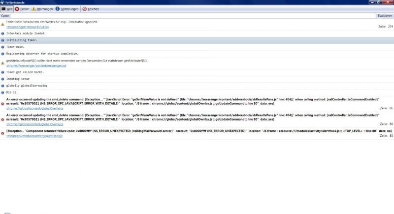 ich habe ca 10 Konten (=mailadressen) schon seit Jahren eingetragen und keines funzt im Moment habe mal noch einiges bei Thunderbird durchgesehen und die Fehlerkonsole hier mal beigefügt