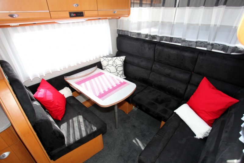 Nachdem wir schon im Wohnzimmer ein gelb-orangefarbenes Sofa haben, gab’ diesen Farbton auch im Wohnwagen. Glücklicherweise hatte unser Sofa schon unter den Blue-Jeans gelitten und die vorderen Kanten waren schon reichlich Dunkel geworden, so dass wir bei der Auswahl der Wohnwagenpolster aus diesen Erfahrungen schöpfen konnten. Die vorderen Kanten sind in bordeaux-farben. Als Stoff haben wir eine Microfaser genommen, die hautfreundlich ist.