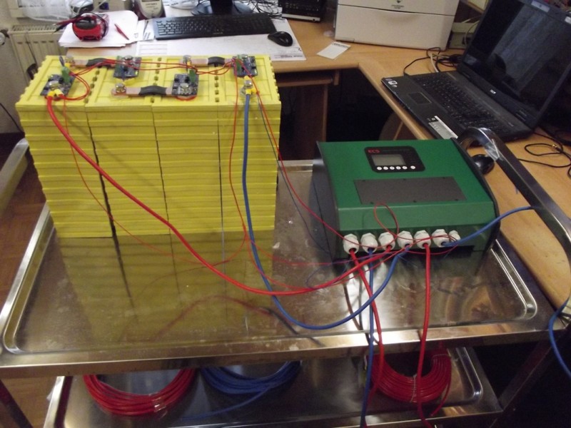 Läuft der gesamte Strom über die Relais? Und damit nur 20bzw40A Ladung/Entladung möglich???? Wenn ein Relais „zB Ladegerät abschaltet“ braucht man dann für weitere Stromquellen weitere Relais oder wird die LiFePo getrennt? Wann braucht man Kühlkörper? Und bekommt auch ein Nicht-Elektriker/-Elektroniker den gesamten Kabelsalat zusammen? Oder was braucht man an „Kleinzeug“ (Kabel etc, Werkzeug)? Oder gibt’s jemand, der das Ganze ordentlich zusammenbaut? Wie lässt sich eine Kapazitätsanzeige integrieren? Rossi Hallo rossifumi, die Prints werden unter den Zellverbinder auf jeder Zelle verschraubt.Daher ist auf der Platine eine Bohrung für die M8 Schraube.Weil es unterschiedlich große Zellen gibt wird der andere Pol mit einem Kabel und Ringkabelschuh auf den anderen Pol verschraubt.Auf der Platine sind Reihenklemmen wo nur ein dünnes Kabel von Platine zu Platine gezogen wird.Dies wiederum wird an die Relais angeschlossen.Außer Kabel,Schraubendreher und Abisolierzange ist nichts nötig.Für die Kapazitätsanzeige geht ein normaler Battmonitor der bei der Peukerteinstellung auf 1 gesetzt wird.Bei den Relais wird es noch Lösungen geben um auch sehr hohe Ströme zu schalten.Angedacht ist erst mal der Anfang über den Fernbedienungseingang des Wechselrichters und normale Solaranlagen.Relais die die selbe Arbeitsspannung haben aber größere Schaltströme vertragen gehen natürlich auch.Für ganz spezielle Anwendungen kann man bei ECS direkt anfragen.Ein Verkabelungsplan wird es auch online geben. So ich habe mal ein neues Bild .Test erfolgreich!Rechts neuer Greencontroller MPP mit Relais. Der Greencontroler ist ein ganz normaler Solarladeregler auf Mpp Basis. Bei einem vorhandenen Regler braucht ihr noch die 2 Relais die der Greencontroler schon drinn hat. ![]() Dass hier mal ein Bild kommt finde ich klasse, ein Bild sagt halt mehr als viele Worte.