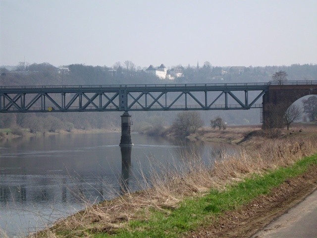 Nach weiteren Radumdrehungen lieht dann am linken Berghang die Ortschaft Fürstenberg mit der bekannten Porzellanmanufaktur, im Vordergrund eine Eisenbahnbrücke