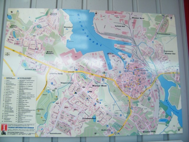 Und hier noch der Stadtplan. Er hängt beim SP aus. So ziemlich genau in der Mitte liegt der SP. Vergrößert euch mal das Bild dann kann man es gut erkennen. Wie ihr seht ist die Altstadt wirklich in wenigen Gehminuten sehr gut zu erreichen. Das Bild könnt ihr euch ruhig runter laden. ![]() Wismar haben wir als wundershön empfunden: