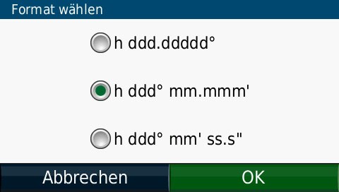 Ich habe bei meinem neuen Garmin (Karten von NavTeq) festgestellt, das der in Hausnummern nicht ganz so treffsicher ist, das Sygic auf dem Smartphone (Karten von Teleatlas) schon eher. Aber die (serienmäßige) Koordinateneingabe geht in beiden Fällen perfekt. Noch eine Anmerkung, vielleicht hat es ja damit zu tun: Viele PKW-Navis unterstützen sogenanntes "Static Navigation", dann wird deine Position nicht aktualisiert, wenn du dich unter 4-5km/h bewegst. Danke für die Tip´s aber es fehlt das Menü " Koordinaten Eingabe " und kein Wort im online Handbuch :twisted: