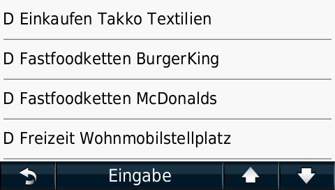 Ja, Garmin hat schon einige POIs integriert, darunter auch Parkmöglichkeiten ![]() ![]() Mit dem hauseigenen POI-Loader kann man weitere POIs aus dem Netz implantieren, z.B. Günstig-Klamotten, Schachtelwirte, Stellplätze oder die Datenbank vom Bordatlas. ![]() Die eigenen POIs erscheinen bei der Zieleingabe als neuer Menüpunkt "Benutzer-POI"