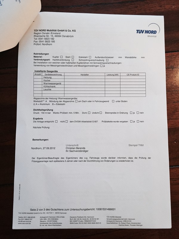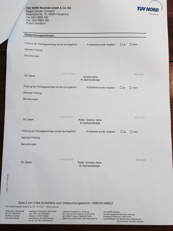 Screenshot ist immer gut, da sieht man auch andere Dinge. z.B. Die Aktualität. Seit´, meines Wissens, 2013/2014 ist eine fehlende/abgelaufene Gasprüfung beim TÜV kein leichter Mangel, sondern ein Grund, die Plakette zu verweigern. Das die Gasprüfung noch gültig ist muss nachgewiesen werden. (Prüfbescheinigung TÜV oder gelbes Gasprüfbuch) Aber u.U. wird es bei den verschiedenen TÜV/Dekra etc Organisationen/Ortsstellen doch recht unterschiedlich gehandhabt. Andreas Ich hatte auch ein mangelhaftes Gasbuch vom Vorbesitzer mitgeliefert bekommen. Was hab ich gemacht: Bin zum TÜV (Werkstatt-TÜV beim WoMo-Händler) mit dem Auftrag, TÜV machen und Gasprüfung. Hab ein neues (gelbes) Gasbuch ausgestellt bekommen (mit Gasprüfung und Prüfsiegel rund 30 Euro oder so) und TÜV hab ich dann auch gekriegt .... War überhaupt kein Problem. Aber das gelbe buch hast du gebraucht. ...so ist auch die Regel. .. natürlich gibt es Ausnahmen. ..aber die regel ist das man das gelbe heft buch braucht Wow, ihr braucht Euch nicht gleich fetzen. Danke für Eure Tipps. Ich werde den Vorbesitzer nach den Unterlagen zur Gasprüfung fragen. Sollte er diese nicht mehr haben, werde ich eine neue Gasprüfung und Dichtigkeitsmessung des Fahrzeugs vornehmen lassen. Zu dem muss das gute Stück noch in die Lackiererei. Also noch ne ganze Palette dran zu machen. LG der WHO Hallo, ich denke das hängt vom ausführenden Prüfer ab. Da er ja die Geräte in den Papieren eintragen muss. Hat er da nichts vorliegen wirds schwer. Wo soll der Prüfer die Teilebezeichnung und Serien Nr. herbekommen, der kriecht garantiert nicht in eurem Auto rum oder baut gar was aus. Ich habs beim örtlichen WoMo- Händler machen lassen und der wollte auf jedenfall das gelbe Buch. Wenn man aber die Bescheinigung (TÜV DIN A4 Blatt) vom letzten mal hat wird es wahrscheinlich auch gehen aber ganz ohne vermutlich nicht. Eagl ob und wie die Gasprüfung abläuft -> Ich habe auch schon einige gemacht - mal hatte ich ein Prüfbuch (das immer gelb war :D ) . Wenn kein Buch vorhanden war wurde eines ausgestellt , das müsste jeder , der die G 607 Berechtigung hat machen :!: --> Link Eine TÜV Bescheinigung ohne Prüfbuch erhalte ich nur bei meinem Gas - PKW....-> Beim Wohnmobil wurde ein neues Buch ausgestellt(auch ein Prüfbuch ist mal voll :mrgreen: ) Hallo, da es ja hier immer wieder User gibt die alle Äusserungen in Frage stellen und meinen alles zu wissen, folgen jetzt Foto´s einer Prüfbescheinigung zur Gasprüfung beim TÜV. ![]() ![]() ![]() Soviel zum Thema: