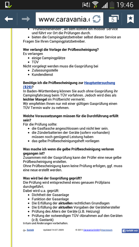 Das musst du schon den TÜV Prüfer fragen oder dort --> Link nachlesen. Hallo, und ja es steht dort das man das Gasbuch mitbringen soll, es reicht aber auch die vom TÜV ausgestellte Bescheinigung. Genauso wie die beim Hersteller ausgefüllte Bescheinigung reicht für die 1. Gasprüfung. Wieso soll ich jetzt den TÜV Prüfer fragen? Ich weiss es ja und will es weiter geben... was sagt den deine Prafixerfahrung? Also nochmals....das Heft muss er haben....oder wieder ein neues gelbes Heft beim nächsten TÜV (2016) neu aus stellen lassen... dort müssen dann die Serien nummern der jeweiligen Geräten drin stehen ....mit wieviel Druck die Anlage läuft etc. und klar gehört es zu seiner frage. ...er ist neuling und kennt sich nicht aus. . ![]() ![]() Hallo, ich geb´s auf, die nächste Bescheinigung vom TÜV werde ich fotografieren und hier einstellen. Du wirst keine Gas Bescheinigung bekommen ohne dieses Heft... auch nicht der alte TÜV Bericht mit bestandener gas Prüfung reicht für den Nächten TÜV. Oder steht dort die eingebauten teile incl Seriennummern? Das steht alles nur in diesem Heft. Im übrigen arbeite ich im Kfz bereich und wir haben jeden Mittwoch den TÜV bei uns Der link verändert sich immer . Habe mal ein Screenshot vom wichtigsten gemacht ![]() Nur mal so unter uns: Isch habe auch kein gelbes Heft und habe in den letzten 8 Jahren immer TÜV und Gasprüfung zusammen gemacht (Werkstatt) :wink: Und ich bekomme TÜV selbst ohne gas Prüfung ;-) Aber es geht hier ja um die Richtigkeit