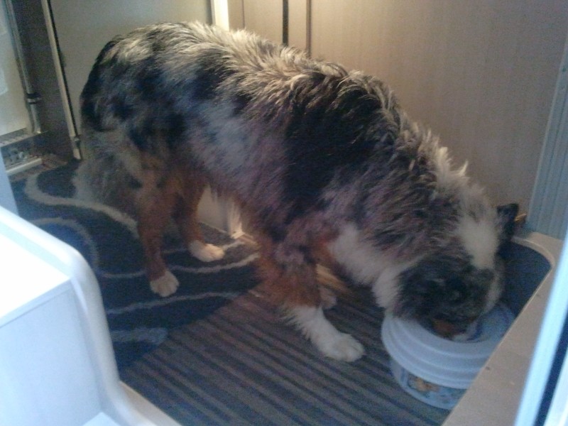 habe meinem Wuffi einen Teil der Heckgarage "Spendiert" und Frauchen dafür den Kleiderschrank unterm Bett "gemoppst" :D In der Laderaumtür ist ein Lüftungsgitter eingebaut - aber auch noch nicht der Weißheit letzter Schluss, denn die sollte schon ganz zu zu machen sein (die jetzige hat immer eine Zwangsbelüftung - war doof bei Sturm und -3° C am Strand :? ) :eek: Aber nicht in der Garage transportieren! Wenn einer drauffährt, dann sind die Wauzis platt! Habe exta einen zusätzliches 3-Punkt-Grutschloss neben der Sitzbank installieren lassen, da wird Wauzi während der Fahrt eingeklinkt. Im Sommer kommt bei offener Laderaumtür ein Alu-Gitter zum Einsatz, so dass Wauzi immer frische Luft hat, aber nicht geklaut wird und keiner durch Luke reinklettern kann. Fotos vom selbstgebauten Gitter habe ich noch gar nicht :roll: Kann man aber mit Phantasie auf dem 2. Foto links an der Wand befestigt erkennen. Hier kann er schön trocknen und den Dreck abrieseln und er ist nicht ganzu außen vor: