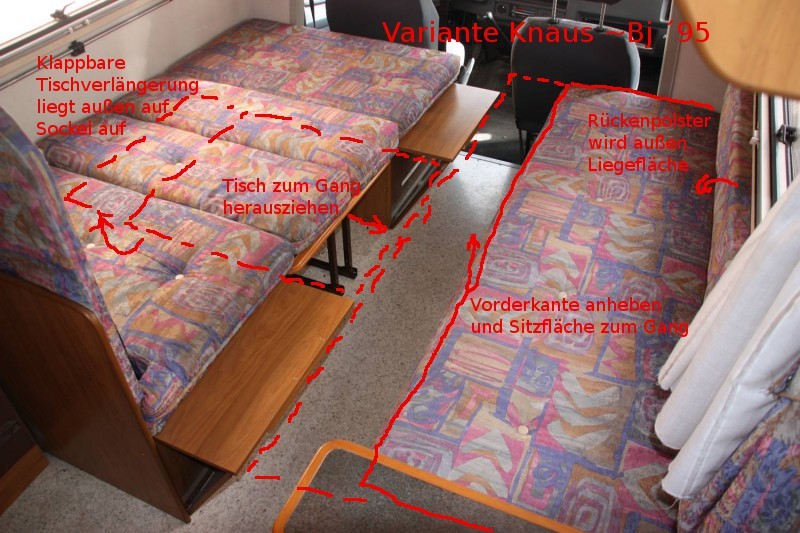 Zur Komplettierung für nachfolgende Leser, weil ich das Bild gerade fertig habe die Version Knaus etwa BJ ´95 Große Sitzbankfläche anheben und zum Gang herausziehen. Große Rückenlehne wird zur Liegefläche. Tisch herausziehen, Klappverlängerung liegt außen auf dem Sockel auf. Wahlweise Tisch umdrehen und Klappverlängerung zum Gang hin hochklappen. ![]()