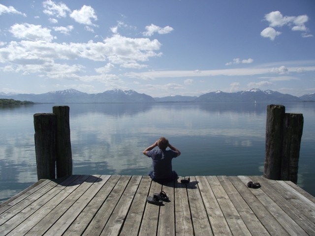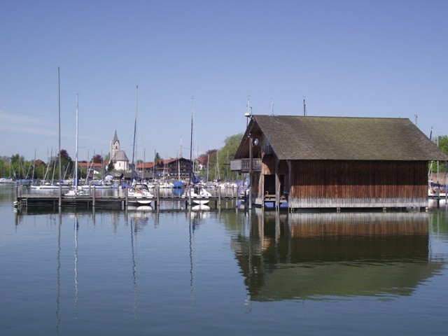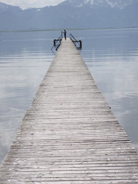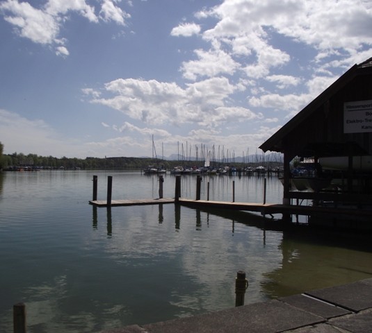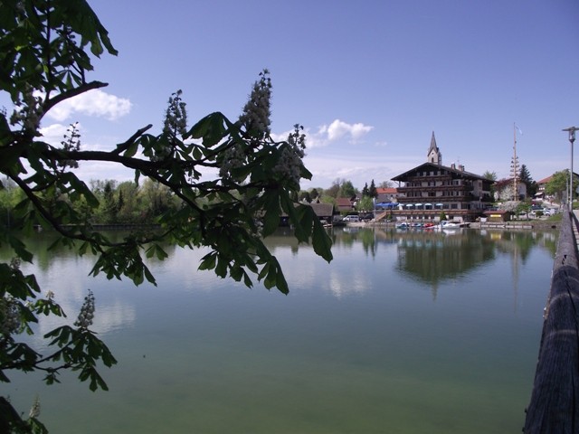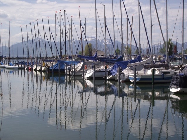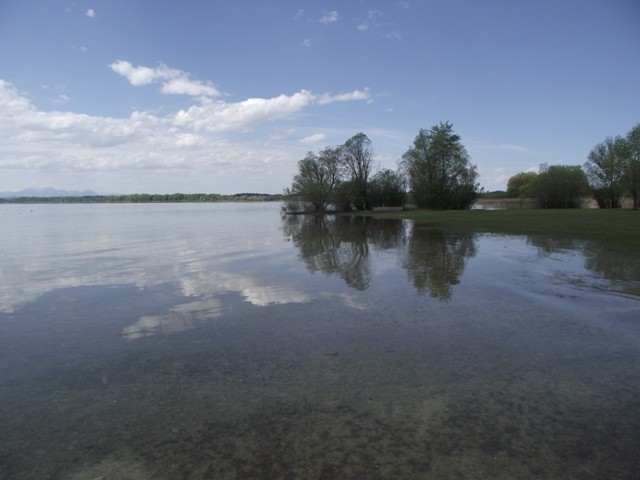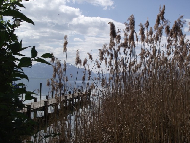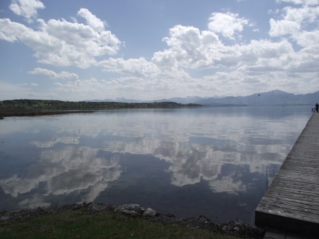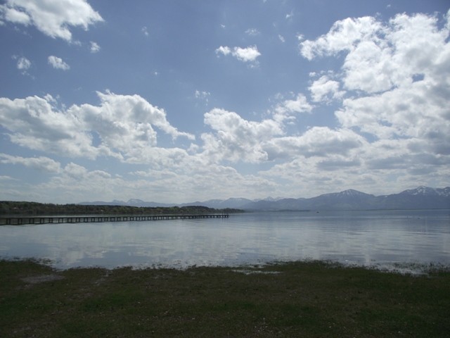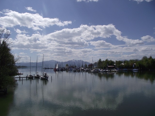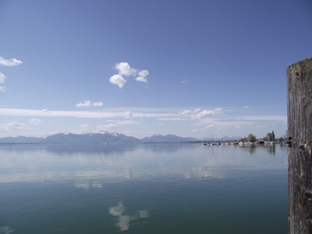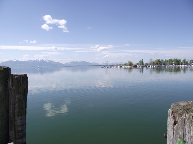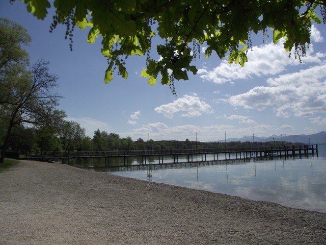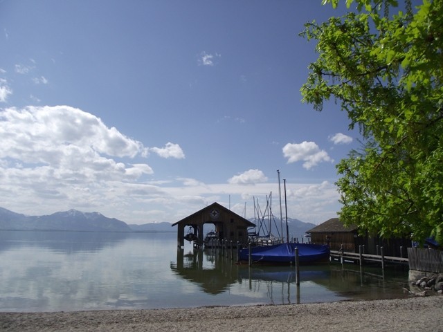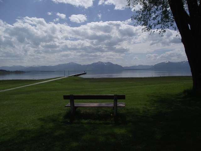 2.05.2012 Im Womo war es recht früh hell, wir hatten vergessen das Heki zu verdunkeln..... die Kirchenuhr von Unterwössen schlug bis 22 Uhr jede Viertelstunde, danach war bis um 6 Uhr morgens Ruhe Dann wurde wieder eifrig im Viertelstundentakt geläutet. Ok, sind wir eben heute sehr früh wach und frühstücken. Der Bäcker war gegenüber der Kirche und es gab heute frische Semmeln und Laugengebäck und für mich eine Rosinenschnecke mit Zimt. Fix aufgeräumt, alles startklar gemacht und los. Wir brauchen bald neues Frischwasser. Dann ging es weiter Richtung Chiemsee. Vorbei an Marquartstein, Prien, dann nach Seebruck direkt am Seeufer. Hier fuhren wir auf den großen Parkplatz am Ortsende und haben eine Riesenrunde am Ufer entlang gemacht. Die Sonne schien, es war wirklich Fotografierwetter. Der See, die hohen schneebedeckten Berge im Hintergrund, die zartgrünen Bäume... Kulisse wie gemalt... Segelboote, Blumen, sanfter Wind... und wieder kaum jemand unterwegs. Nach einem großen Bier auf der Terrasse des Strandbadrestaurants sind wir dann für ein Stündchen ins Womo und haben ein Schläfchen gemacht. Wandern und Bier machen müde. Wir werden hier übernachten, während des Tages haben wir ganz normal Parkgebühren am Automat entrichtet, ab 18 Uhr ist ist hier frei parken und kein Hinweis, dass Womos nicht stehen dürfen. Also stehen wir wieder einmal nicht auf einem ausgewiesenen Stellplatz, wir werden langsam mutiger. Morgen müssen wir allerdings entsorgen und da suchen wir uns dann wieder etwas Offizielles. Das Wasser geht nun auch langsam zur Neige. Mal sehen, wie es morgen weitergeht. Sonntag sind wir schon 4 Wochen unterwegs und es macht immer noch Spaß... :)) Wir werden gleich die große Übersichtskarte ausfalten und mal schauen, wo wir morgen hinfahren werden. Gute Nacht. Chiemsee..... Sonne und ein erholsamer Tag